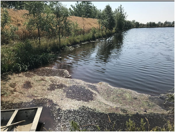 污水塘主要污染为医药化学污染,水体发黑,完全没有透明度,恶臭熏人,长约238米,宽约182米,面积约3.3万平方米,平均水深未知,据介绍为1米左右,底泥较厚;污水通过西南角污水渠流入水体,污水渠中水色发黑,透明度约15cm;在南侧偏东位置有一出水闸门,有水流出直接进入河道;北侧偏东位置,有一入水闸门,暂关停。
