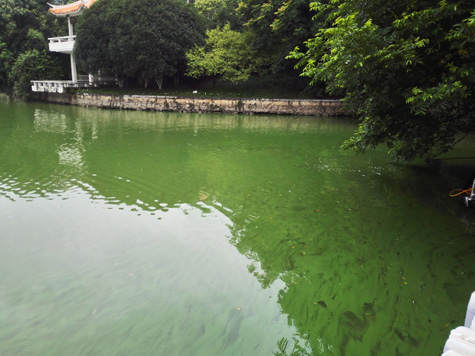 银河公园水质监测指标为地表水劣V类,耐污力很强的蓝藻肆意生长,连续多年蓝藻爆发成害,水体伴有异臭味,呈现严重富营养化状况。